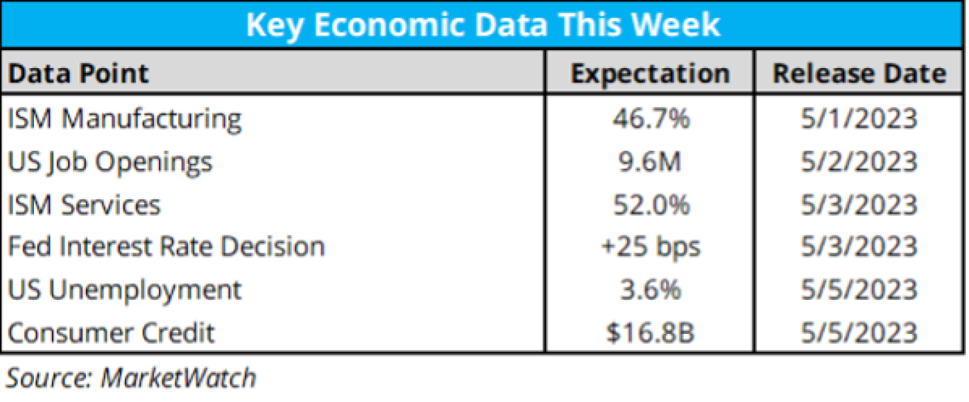 - The most attention this week will go to Wednesday’s Federal Reserve interest rate decision. The market is pricing a high probability of another 25-basis point increase to the Fed Funds rate, which would be the 10th consecutive rate hike since the first increase in March 2022. This 25-basis point increase would result in a total of 5% in increases since the hiking cycle began. Many are speculating that this may well be the last increase we see this year.